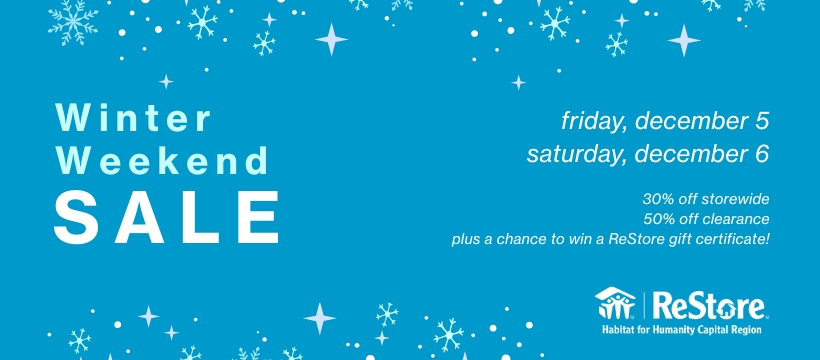 Winter Weekend Sale Friday, December 5th, 9 AM – 6 PM Saturday, December 6th, 10 AM – 3 PM Lansing, St. Johns, and Williamston ReStores Thank you for helping us celebrate National Thrift Shop Day 2025 by supporting your favorite local thrift store: Habitat Capital Region ReStore! Event Highlights ❄️ Save the Date! ❄️ Our…